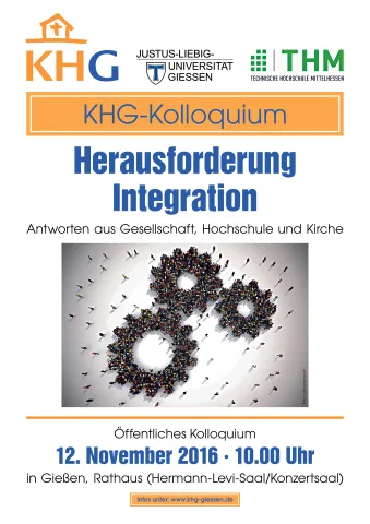 Die Katholische Hochschulgemeinde Gießen (KHG) veranstaltete am Samstag, den 12. November 2016, im Hermann-Levi-Saal des Rathauses Gießen ihr viertes Kolloquium und Symposium mit einem hochaktuellen Programm und mit namhaften Referenten. Im Mittelpunkt stand das Thema, wie die Eingliederung von Flüchtlingen und Migranten in unsere Gesellschaft gelingen kann. Gesellschaft, Politik, Hochschule und Kirche sind gefordert. Das Kolloquium, das im Rahmen des 90-jährigen Jubiläums der KHG Gießen stattfand, wurde von der KHG gemeinsam mit der Justus-Liebig-Universität Gießen und der Technischen Hochschule Mittelhessen veranstaltet.