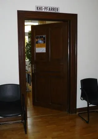 Linker Hand liegt zuerst das Büro von Frau S. Monnheimer M.A., das nach Charles de Foucauld benannt ist. Dann ebenfalls links befindet sich das Büro des Hochschulpfarrers Dr. S. Karl. Es trägt den Namen des Theologen Karl Rahner.