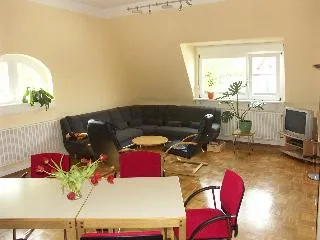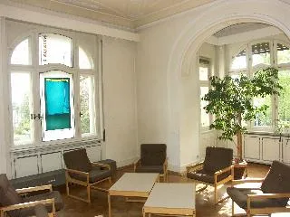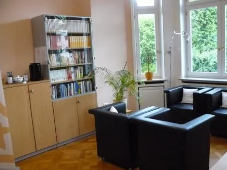 Hier findet sich ein Sofa, die Möglichkeit des Fernsehens und Tische und Stühle für Besprechungen und Arbeitsgruppen. Die Bezeichnung Bibliothek rührt daher, dass einmal alle Wände mit Bücherregalen versehen waren. | ||