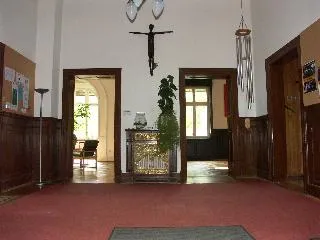 Wendet man sich nach links, finden sich das Sekretariat und "Le Monde" das Internetcafe und Zeitungszimmer, geradeaus "Café Mathilde" und "Kettelersaal" sowie rechts der Zugang zur Küche und der sog "Sakristei", einem Vorraum.