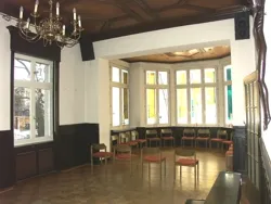 Der Kettelersaal ist der größte Raum im Haus und besticht durch sein klassisches Ambiente sowie die bunten Glasfenster in der großen "Apsis". An der langen Wand befindet sich ein Bild von Bischof Ketteler, das extra für die KHG gemalt wurde. |